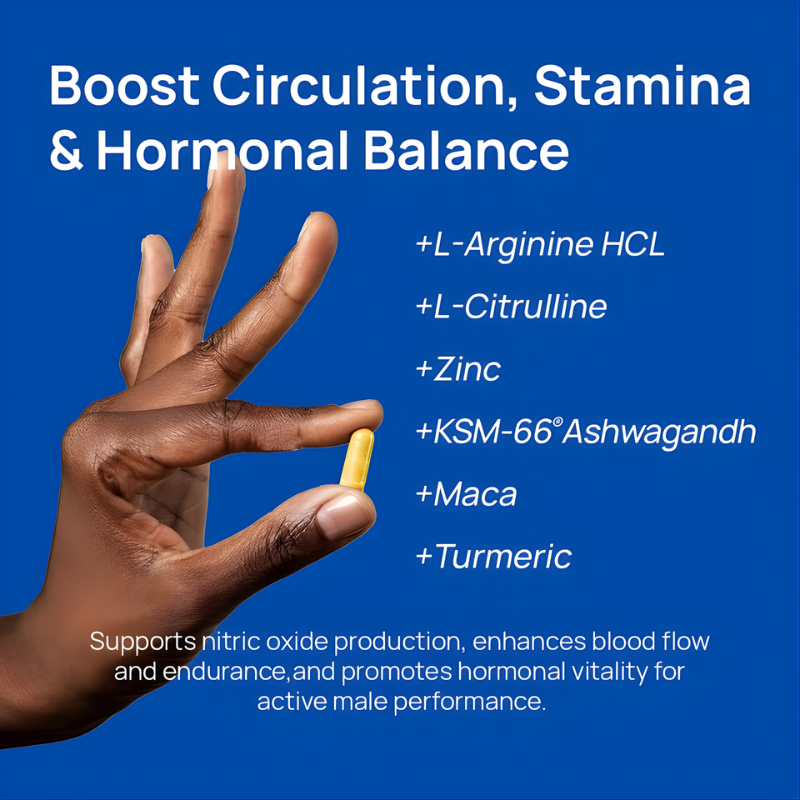 Clinically supported ingredients like L-Arginine, Citrulline, and herbal circulation boosters work together to support healthy blood flow, enhance stamina, and promote natural male performance — all in one pharmaceutical-grade daily capsule.